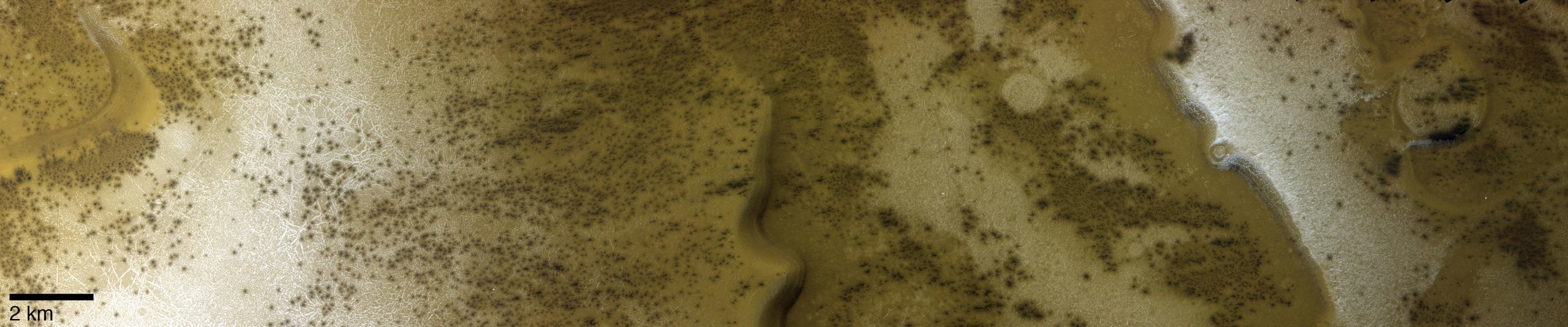 Иней можно увидеть в многоугольных трещинах на местности, что указывает на наличие водяного льда, внедренного в почву. Черные пятна, наблюдаемые на протяжении всей сцены, связаны с тем, что темная почва проталкивается через трещины в льду из углекислого газа, когда он сублимируется — превращается непосредственно из твердого льда в пар — в летние месяцы.