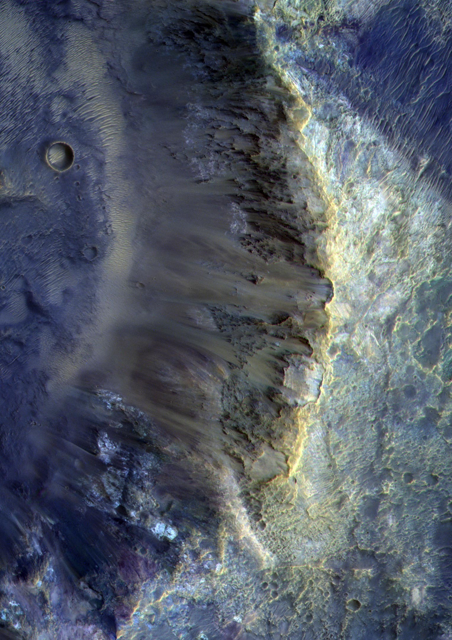 На этом изображении изображена юго-восточная стена небольшого кратера, расположенного в нескольких сотнях километров к северу от гигантского ударного бассейна Эллада на Марсе. Сам кратер имеет диаметр около 12 км. На этом изображении показан участок размером 5×10 км. Система формирования цветных и стереофонических изображений поверхности (CaSSIS) на борту орбитального аппарата ExoMars Trace Gas Orbiter сделала снимок 19 октября 2020 года.