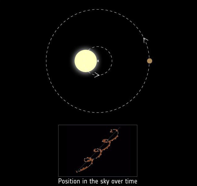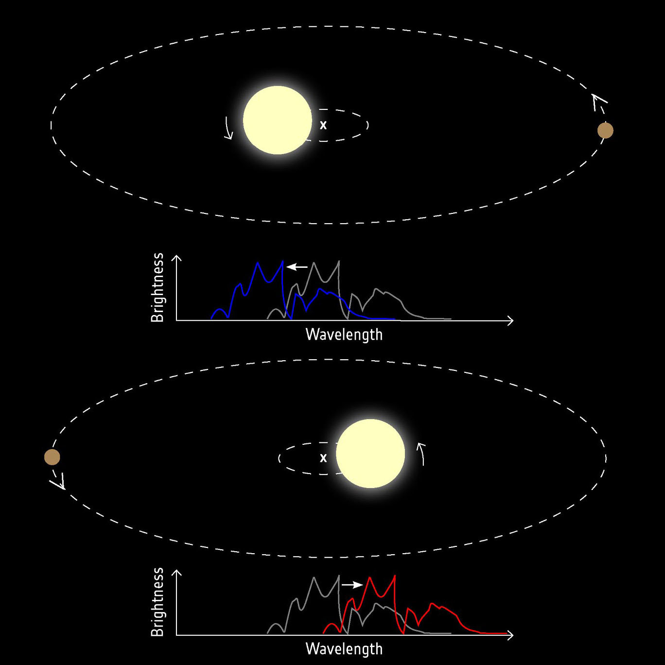51 Pegasi b был обнаружен с помощью наземной обсерватории, обнаружив «колебания» в движении своей звезды. Такие колебания вызваны гравитационным притяжением планеты, когда планета и звезда вращаются вокруг общего центра масс. Если смотреть издалека, кажется, что звезда движется к наблюдателю и удаляется от него. Это движение заставляет свет звезды казаться немного более голубым, когда она движется к наблюдателю, и немного краснее, когда она удаляется. Этот сдвиг частоты известен как эффект Доплера, тот же эффект, что и изменение высоты тона сирены скорой помощи, когда она проносится мимо вас. Большинство ранних открытий экзопланет было сделано с использованием так называемого метода лучевых скоростей.