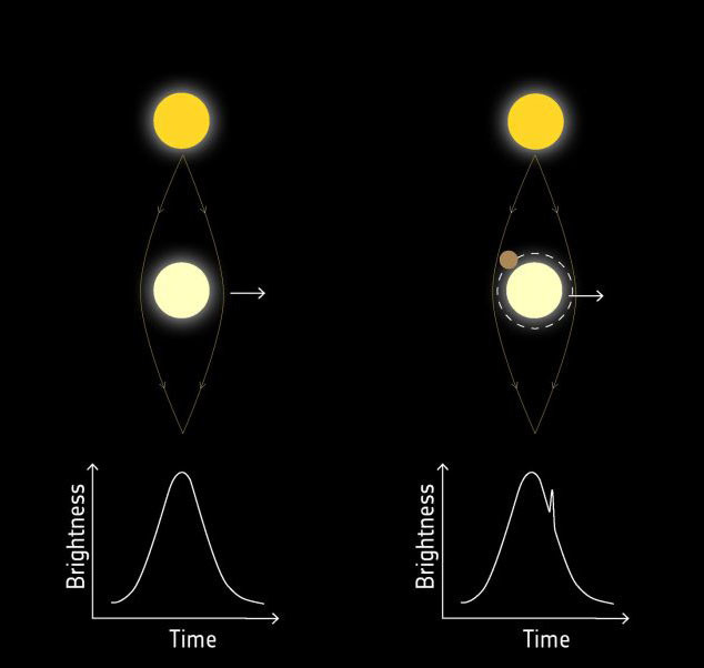 Микролинзирование основано на случайном совмещении двух звезд с наблюдателем. Когда одна звезда пересекает другую, более близкая звезда действует как линза, искривляя свет, так что яркость плавно увеличивается и уменьшается. Если планета находится вокруг более близкой звезды, ее сила тяжести также искривляет световой поток, вызывая всплеск. Этим методом было обнаружено более 70 планет, но обнаружение невозможно повторить.