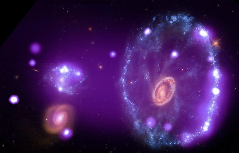 Эта галактика напоминает бычий глаз, что вполне уместно, потому что ее внешний вид частично связан с меньшей галактикой, которая прошла через середину этого объекта. Сильное столкновение породило ударные волны, которые прокатились по галактике и спровоцировали образование большого количества звезд. Рентгеновские лучи от Chandra (пурпурный) показывают возмущенный горячий газ, изначально находившийся в галактике Колесо Телеги, который в результате столкновения уносится более чем на 150 000 световых лет. Оптические данные Hubble (красный, зеленый и синий) показывают, где это столкновение могло вызвать звездообразование.