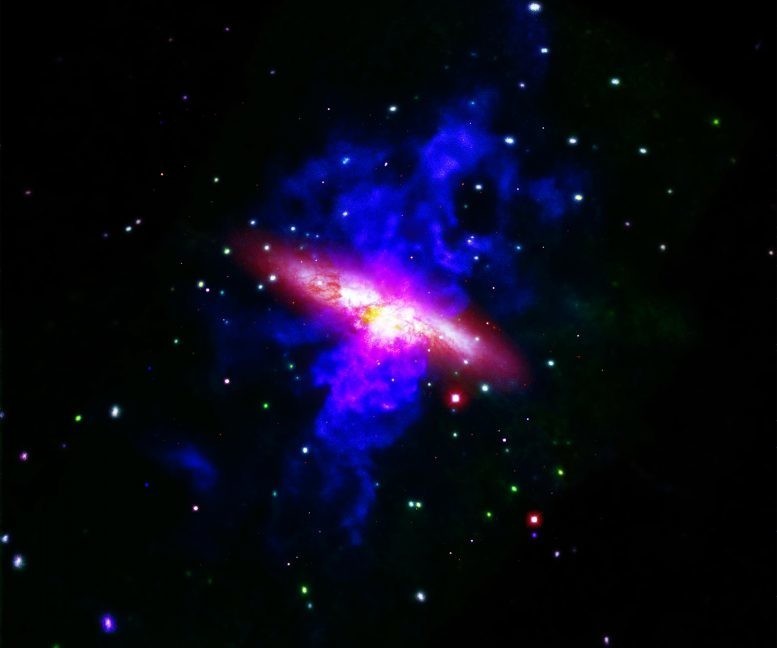 Мессье 82 или M82 — это галактика, ориентированная на Землю ребром. Это дает астрономам и их телескопам интересное представление о том, что происходит, когда в этой галактике происходят вспышки звездообразования. Рентгеновские лучи от Chandra (выглядящие синим и розовым) показывают газ в потоках длиной около 20 000 световых лет, который был нагрет до температуры выше десяти миллионов градусов в результате многократных взрывов сверхновых. Данные по оптическому свету космического телескопа Hubble (красный и оранжевый) показывают саму галактику.