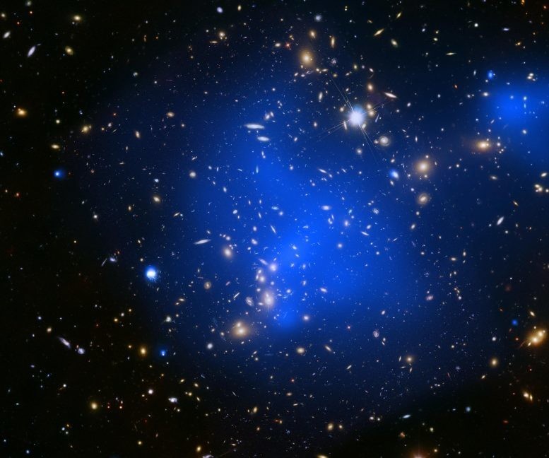 Скопления галактик — крупнейшие объекты во Вселенной, удерживаемые вместе гравитацией. Они содержат огромное количество газа с температурой в десятки миллионов градусов, который ярко светится в рентгеновских лучах, и его можно наблюдать через миллионы световых лет между галактиками. Это изображение скопления галактик Abell 2744 объединяет рентгеновские лучи от Chandra (диффузное синее излучение) с данными оптического света от Hubble (красный, зеленый и синий).