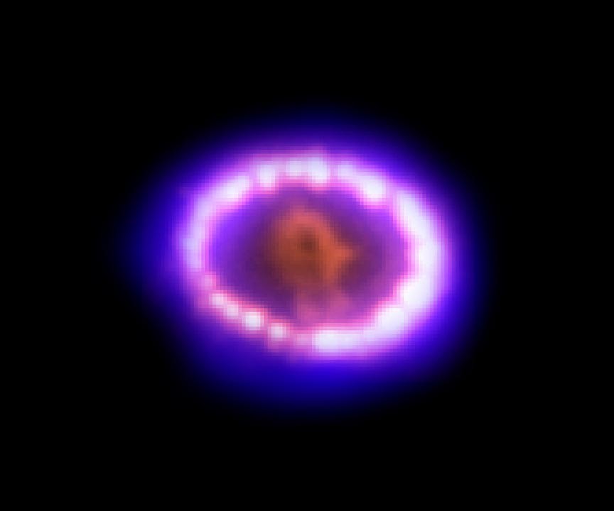 24 февраля 1987 года наблюдатели в южном полушарии увидели новый объект в соседней галактике под названием Большое Магелланово Облако. Это был один из самых ярких взрывов сверхновой за столетия, вскоре получивший название Сверхновая 1987A (SN 87A). Данные Chandra (синие) показывают местоположение ударной волны сверхновой — похожей на волны звукового удара — взаимодействующей с окружающим материалом примерно в четырех световых годах от исходной точки взрыва. Оптические данные Hubble (оранжевый и красный) также показывают свидетельства этого взаимодействия в кольце.