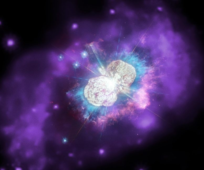 Какая следующая звезда в нашей галактике Млечный Путь взорвется как сверхновая? Астрономы не уверены, но один кандидат находится в Eta Carinae, изменчивой системе, содержащей две массивные звезды, которые вращаются вокруг друг друга. Это изображение имеет три типа света: оптические данные (отображаются белым) и ультрафиолетовые лучи (голубые) от Hubble и рентгеновские лучи от Chandra (отображаются как пурпурное излучение). Предыдущие извержения этой звезды привели к образованию кольца горячего газа, распространяющего рентгеновские лучи, диаметром около 2,3 световых лет, окружающего эти две звезды.
