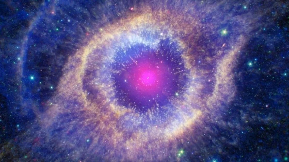 Когда у звезды, такой как Солнце, заканчивается топливо, она расширяется, и ее внешние слои вздуваются, а затем ядро звезды сжимается. Эта фаза известна как «планетарная туманность», и астрономы ожидают, что наше Солнце войдет в эту стадию примерно через 5 миллиардов лет. Это изображение спиральной туманности содержит инфракрасные данные космического телескопа NASA Spitzer (зеленый и красный), оптический свет от Hubble (оранжевый и синий), ультрафиолетовый свет от NASA Galaxy Evolution Explorer (голубой) и рентгеновские лучи Chandra (отображаются белым цветом), показывающие белый карлик , образовавшийся в центре туманности. Размер изображения составляет около четырех световых лет.
