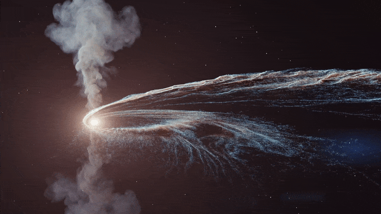 Около половины звездных обломков было выброшено в космос, а другая половина осела на вращающийся диск вокруг черной дыры. Этот «аккреционный диск» чем-то похож на водоворот воды над сливом ванны. Перед тем, как погрузиться в небытие, вещество аккреционного диска становится все горячее и горячее и ярко светится. Это свечение было впервые обнаружено Центром переходных процессов Цвикки (ZTF) на горе Паломар в Калифорнии 9 апреля 2019 года.