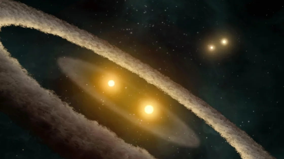 Эта система, обнаруженная при активном участии группы астрономов-любителей, занимавшихся просмотром общедоступных наборов данных обсерватории NASA TESS (спутник для исследования транзитных экзопланет), состоит из трех звезд. Две из них образуют «классическую» пару, вращающуюся друг вокруг друга, в то время как орбита третей звезды пролегает вокруг парочки. Но и на этом необычность системы не заканчивается. Астрономы уже наблюдали и более причудливые формы звездного соседства, такие как HD 98800 (на фото выше) состоящую сразу из четырех звезд. Дело в размере.