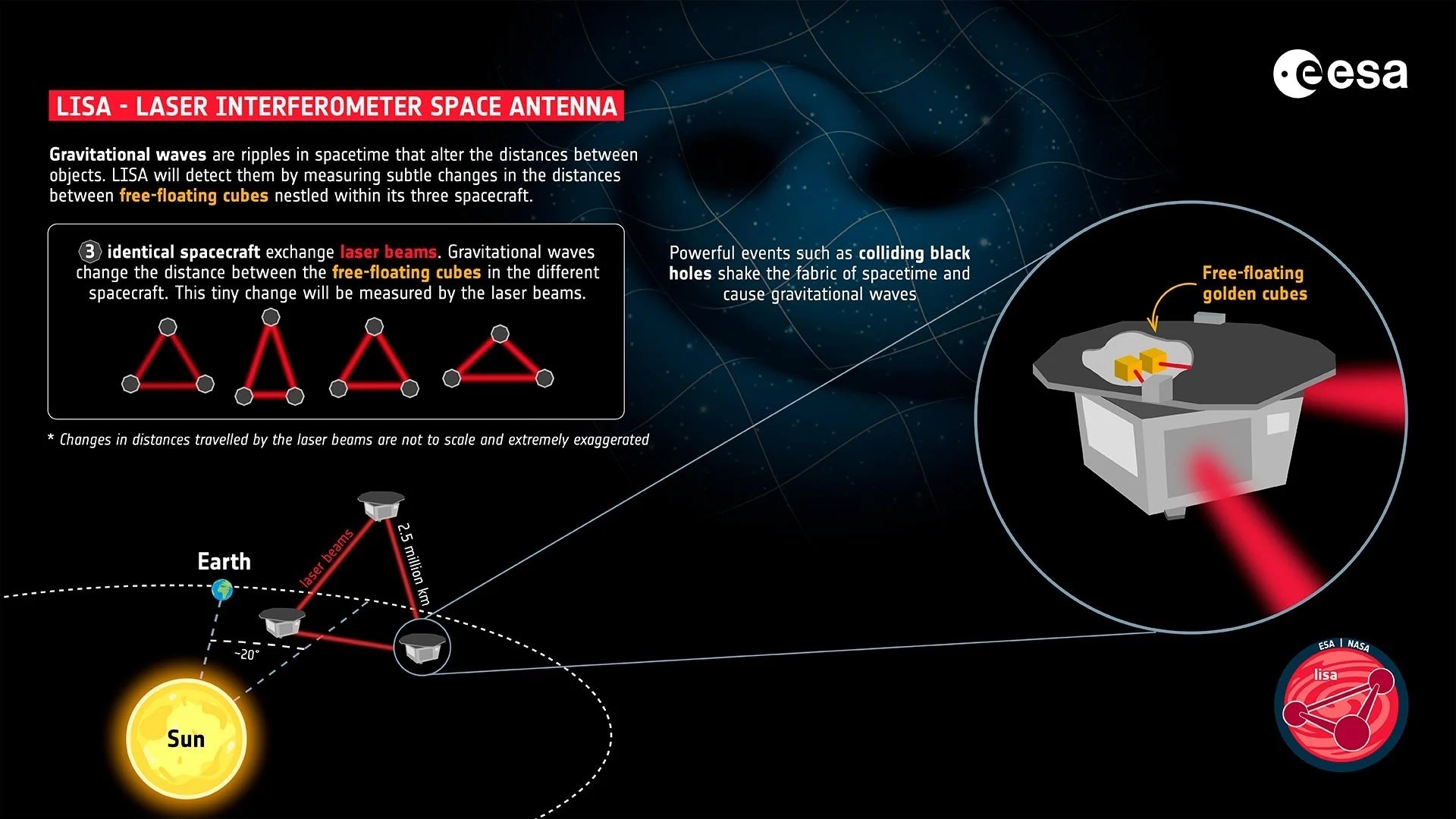 Космический корабль LISA будет использовать пары твердых золото-платиновых кубиков, называемых тестовыми массами, для обнаружения гравитационных волн. Они будут свободно плавать в специальном корпусе в центре каждого космического корабля. Гравитационные волны вызовут мельчайшие изменения в расстояниях между массами, и LISA будет отслеживать эти изменения с помощью лазерной интерферометрии.