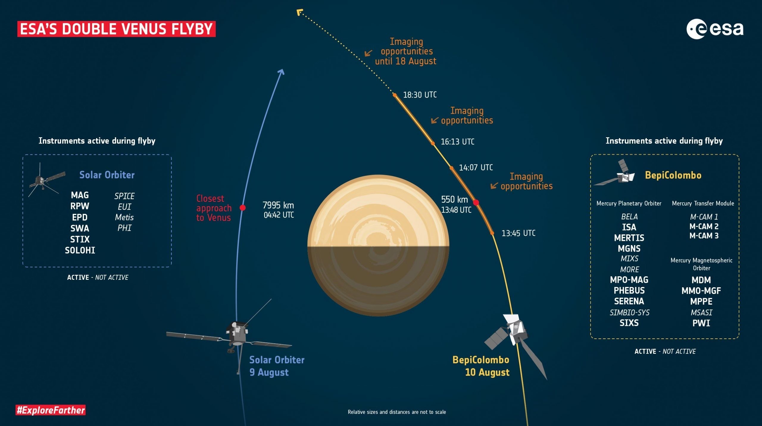 Solar Orbiter, совместный проект ESA и NASA, полетит к Венере 9 августа с минимальным сближением на 7995 км. На протяжении всей своей миссии он совершает повторяющиеся облеты Венеры с помощью гравитации, чтобы приблизиться к Солнцу и изменить его орбитальное наклонение, выводя его из плоскости эклиптики, чтобы получить лучший — и первый — вид полюса Солнца.