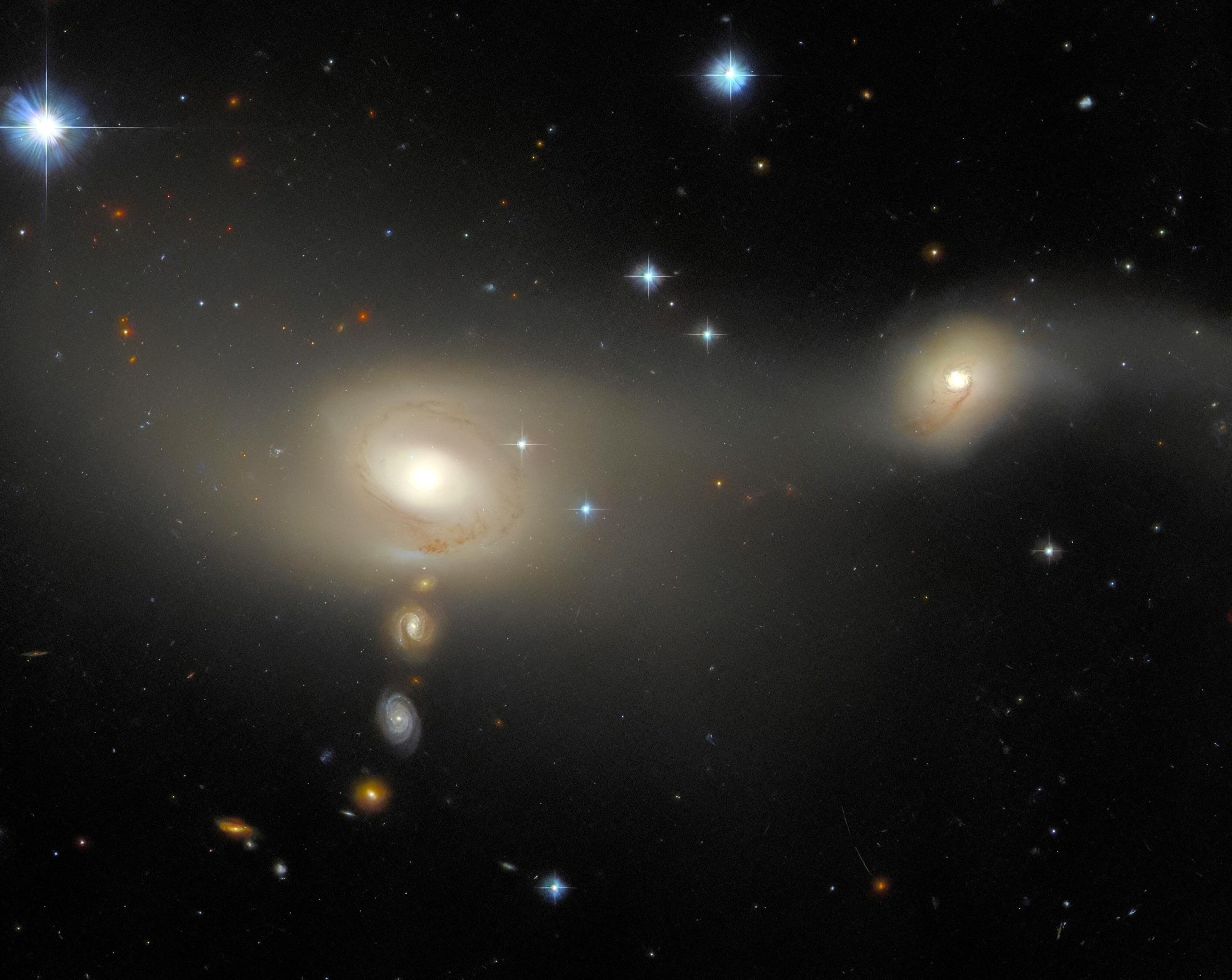 На этом изображении представлена взаимодействующая система галактик, известная как Арп-Мадор 2105-332, находящаяся примерно в 200 миллионах световых лет от Земли в созвездии Микроскопия. Это одна из галактик, включенных в каталог пекулярных галактик Арпа-Мадора, и как и другие снимки, сделанные Хабблом в последнее время, она предоставляет высококачественное изображение.
