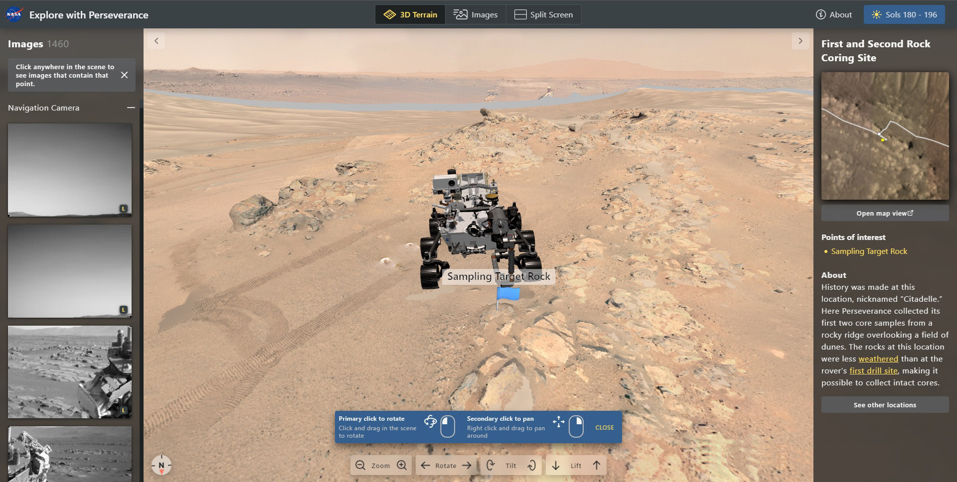 Совершить такое путешествие можно двумя путями. Первый сервис называемый «Исследуй с Perseverance«, позволяет вам следовать за марсоходом, как если бы вы стояли на поверхности Марса. Вся картина основана на данных Advanced Science Targeting Tool for Robotic Operations (ASTTRO), который научная группа марсохода использует для выбора интересных целей для изучения марсоходом. Данные были обработаны, чтобы сделать опыт использования более удобным для пользователя.
