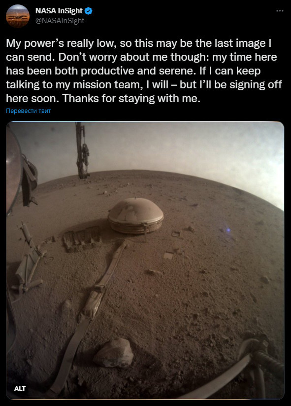 Для людей, которые пристально следят за прогрессом всех инопланетных миссий, не будет секретом тот факт, что конец посадочного модуля MASA Mars InSight давно был близок. Причина довольно проста — источник питания космического корабля продолжал истощаться из-за переносимой ветром пыли, скапливающейся на его солнечных панелях. Теперь, похоже, печальный день настал. Последнее сообщение учетной записи NASA InSight в Твиттере показало, что эта фотография может быть последним изображением, отправленным с космического корабля, поскольку Insight сообщает, что его «мощность действительно низкая».