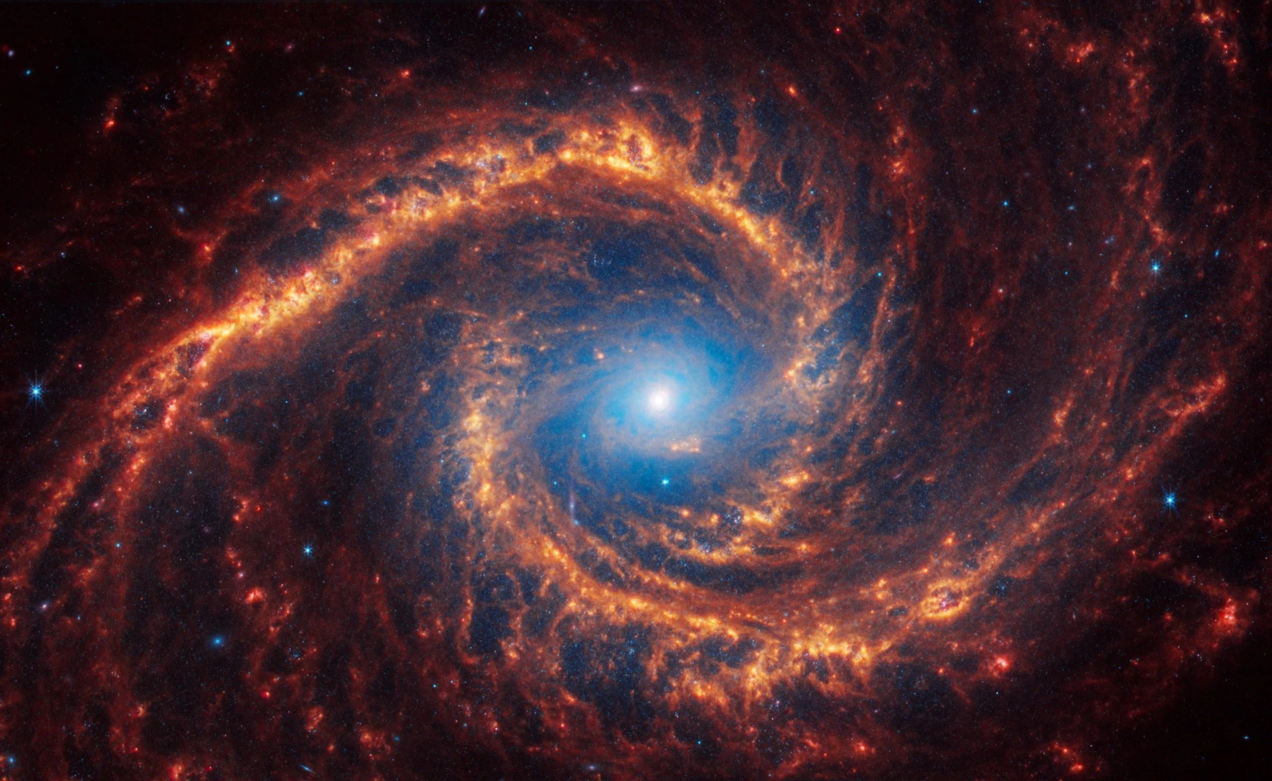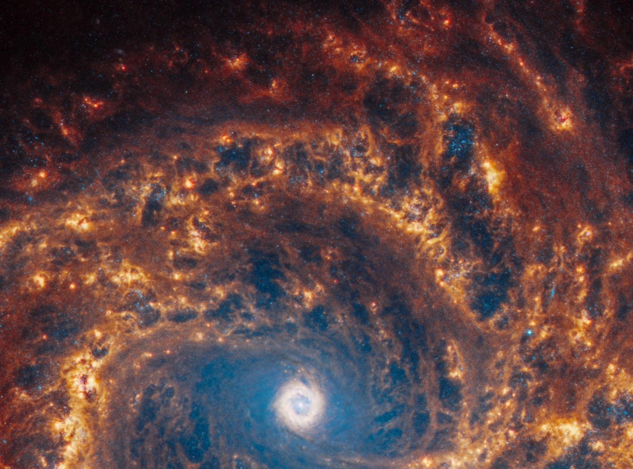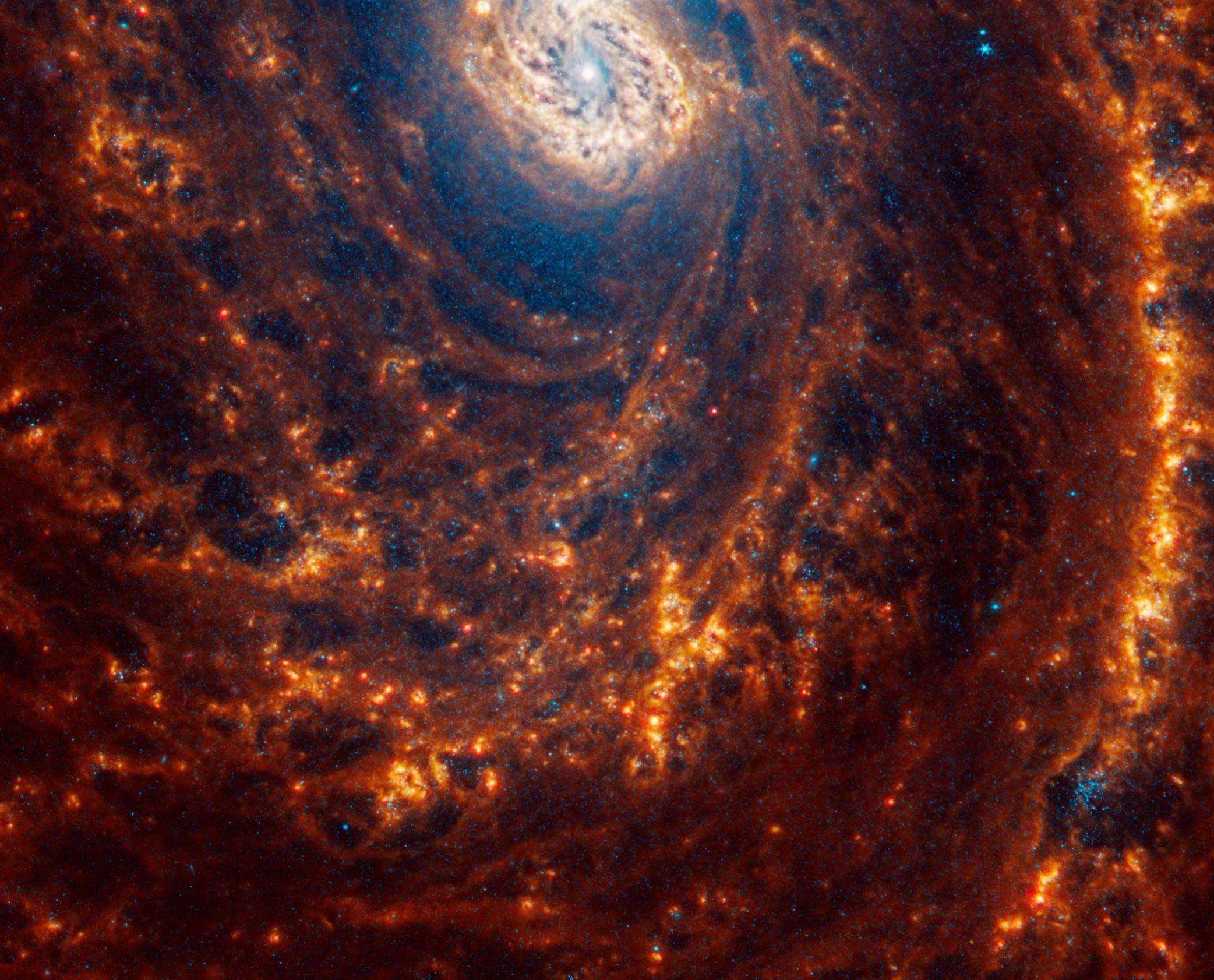 Легко увлечься красотой спиральных галактик, следуя за их звездными рукавами к центру, где могут находиться древние звездные скопления и активные сверхмассивные черные дыры. Только космический телескоп NASA, названный в честь Джеймса Уэбба, способен предоставить высокодетализированные изображения близлежащих галактик в инфракрасном диапазоне, объединяя данные из ближнего и среднего инфракрасного спектра. Эти изображения являются частью программы «Физика в высоком угловом разрешении в близлежащих галактиках» (PHANGS), поддерживаемой международным сообществом астрономов.