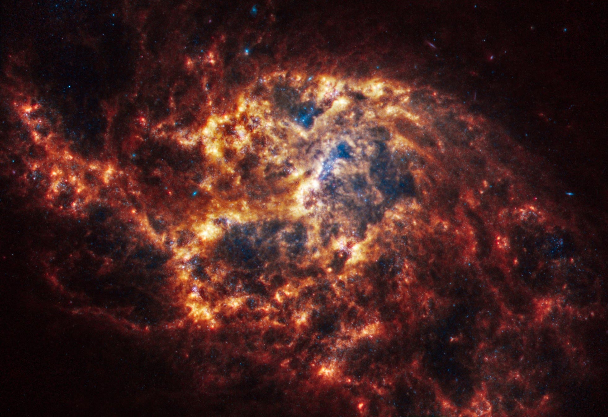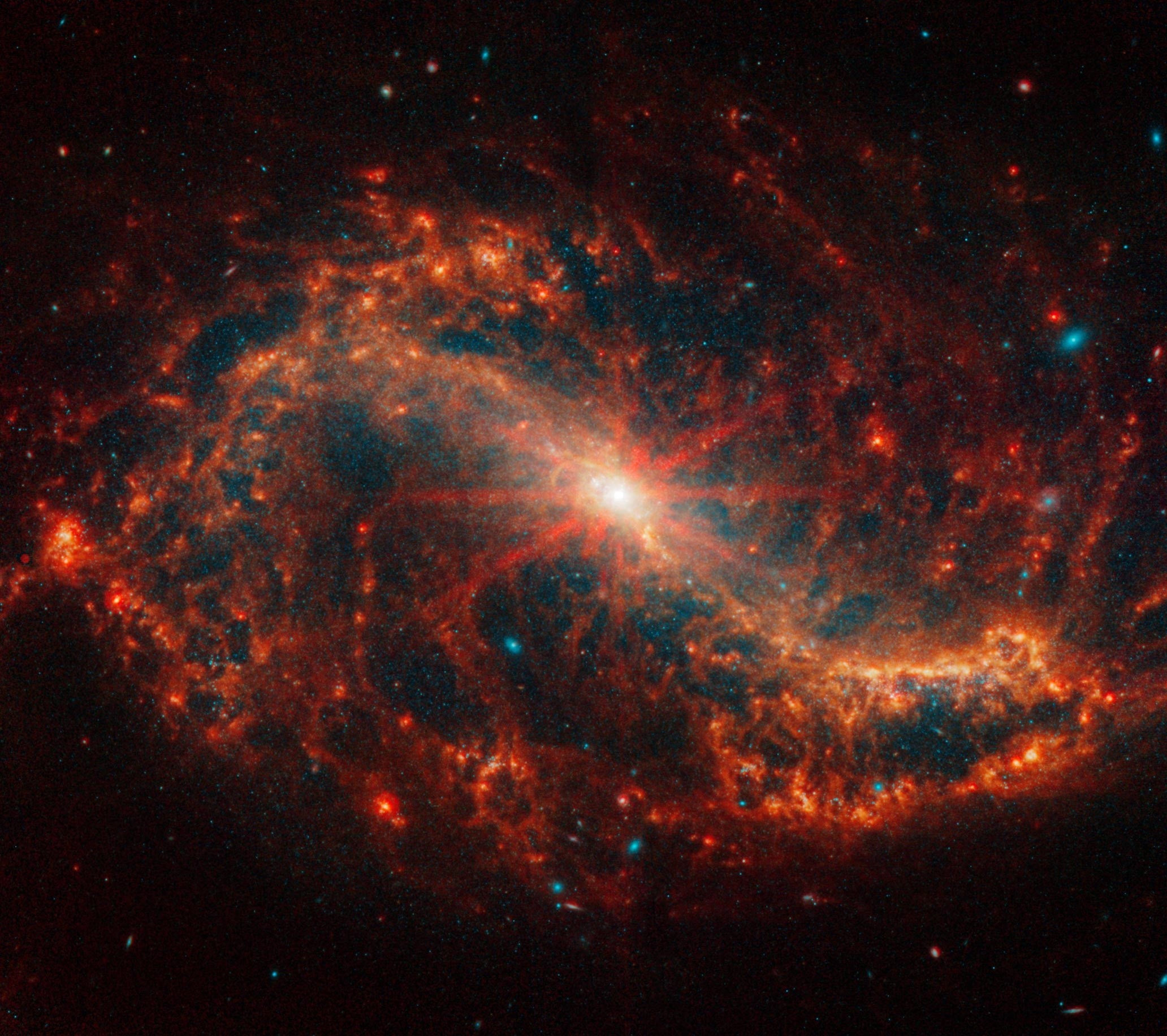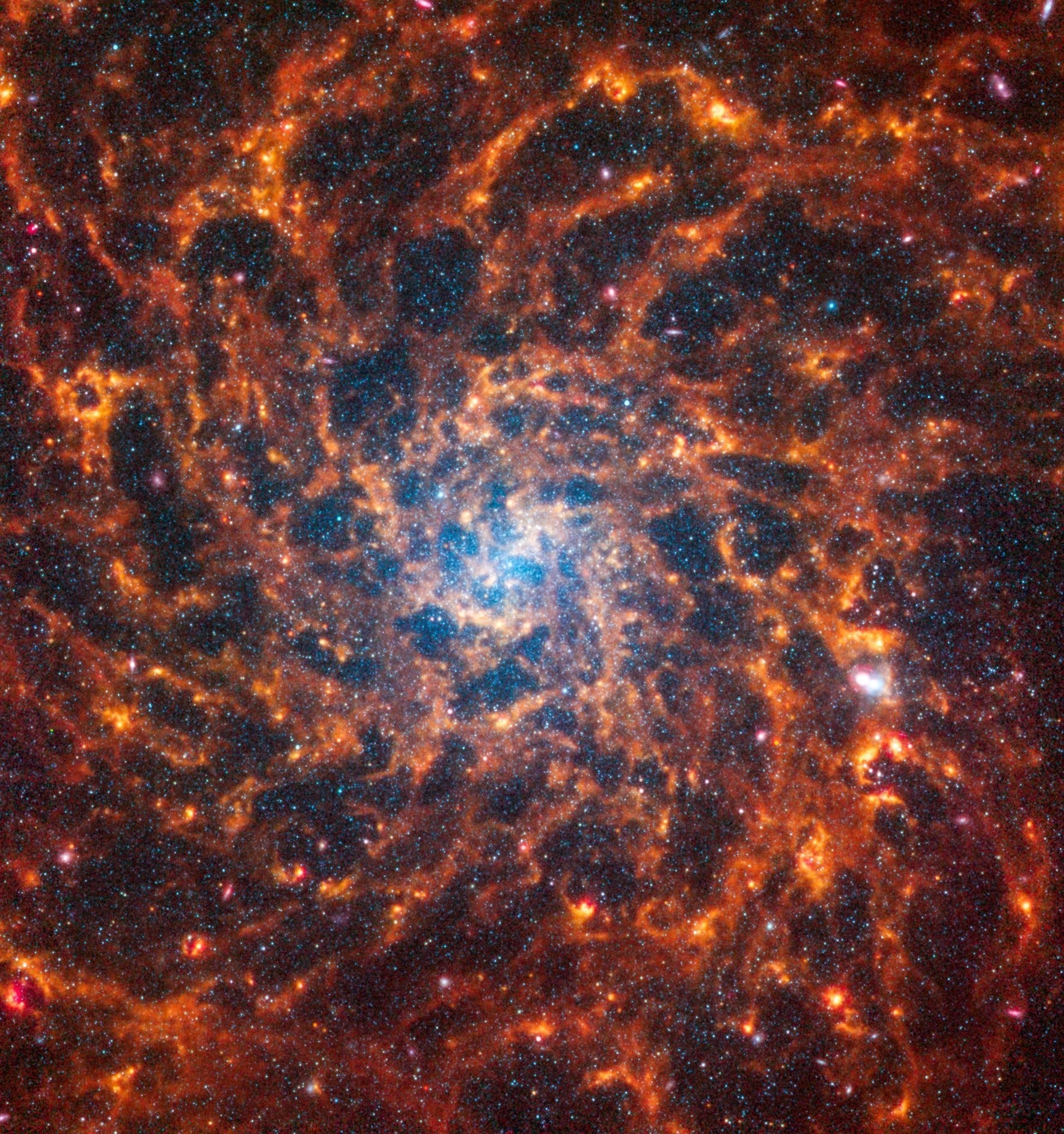 Легко увлечься красотой спиральных галактик, следуя за их звездными рукавами к центру, где могут находиться древние звездные скопления и активные сверхмассивные черные дыры. Только космический телескоп NASA, названный в честь Джеймса Уэбба, способен предоставить высокодетализированные изображения близлежащих галактик в инфракрасном диапазоне, объединяя данные из ближнего и среднего инфракрасного спектра. Эти изображения являются частью программы «Физика в высоком угловом разрешении в близлежащих галактиках» (PHANGS), поддерживаемой международным сообществом астрономов.