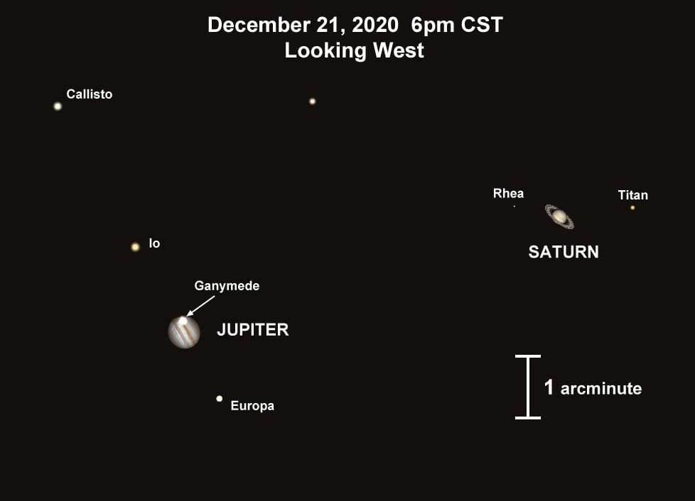 Вечером самого близкого приближения будет 21 декабря. Сатурн и Юпитер будут выглядеть как двойная планета, разделенная лишь 1/5 диаметра полной Луны. Для большинства смотрящих в телескоп каждая планета и несколько их самых больших спутников будут хорошо видны.