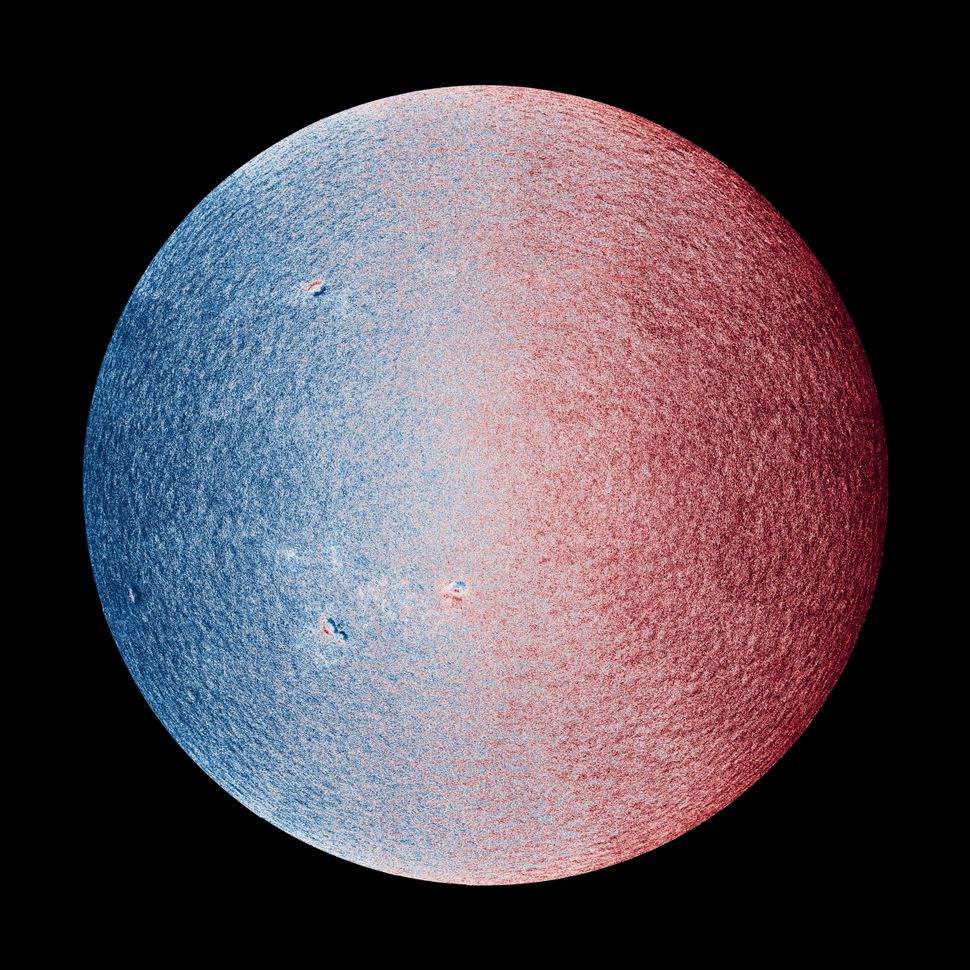 На тахограмме, ещё одном изображении от PHI, отображена динамика солнечной поверхности. Голубые области указывают на движение плазмы к зондy, а красные — на удаление. Такое наблюдение позволяет фиксировать вращение Солнца и прослеживать взаимодействие магнитных полей.