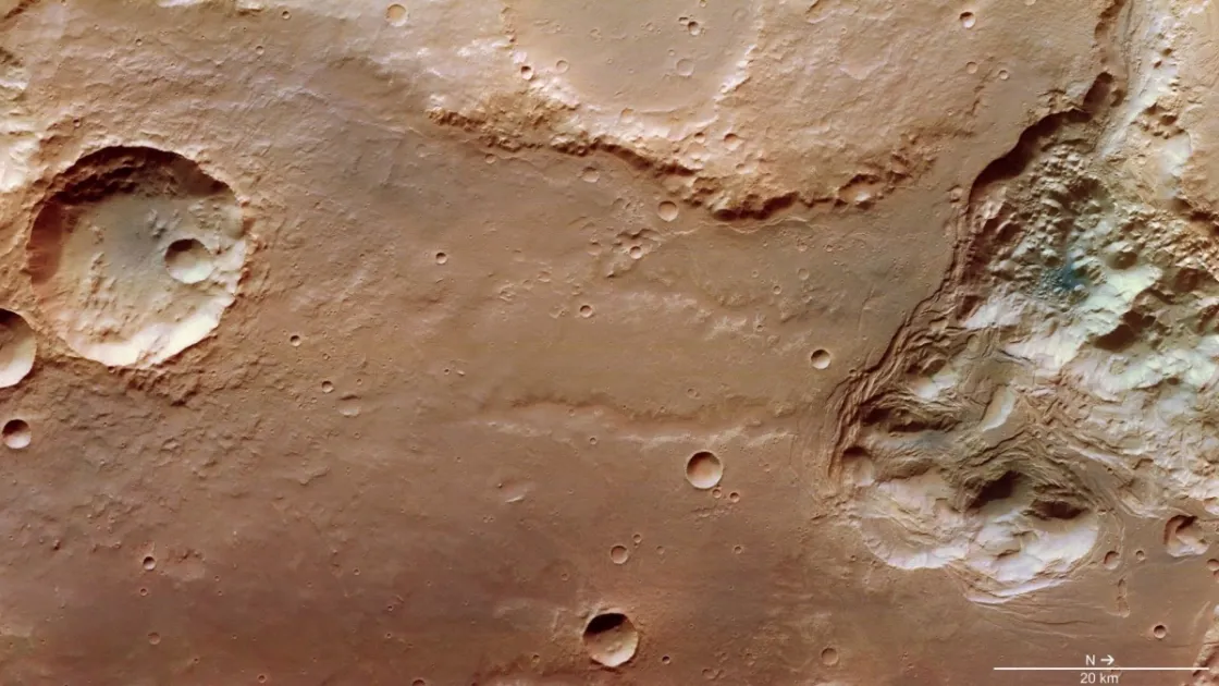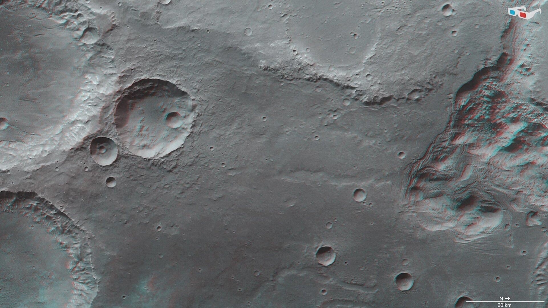 В хаотической местности, видимой здесь, лед растаял, образовавшаяся вода улетучилась, а несколько разрозненных сломанных «блоков» остались стоять в теперь пустых полостях (в которых когда-то находился лед). Примечательно, что дно этих впадин лежит примерно на четыре километра ниже более плоской поверхности возле кратеров слева, что ясно видно на соответствующем топографическом изображении — колоссальная разница в высоте (для справки, самые высокие горные вершины Пиренеев и Альп максимальная — чуть более 3,4 км и 4,8 км соответственно).