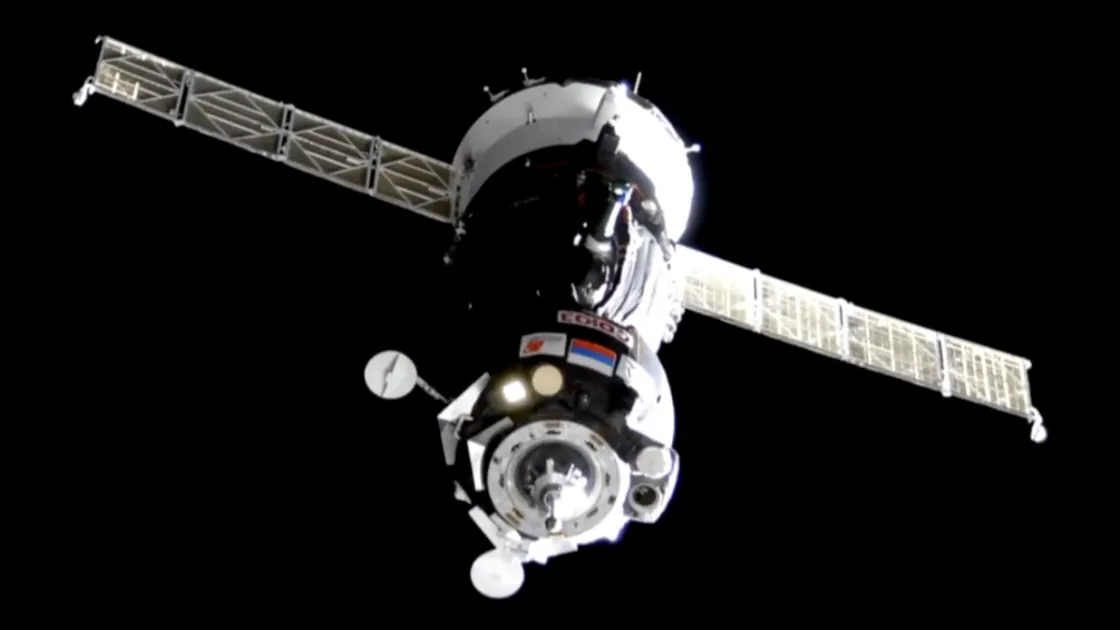В этом ролике показан момент сближения «Союза» с МКС и его присоединение к стыковочному узлу модуля «Рассвет».