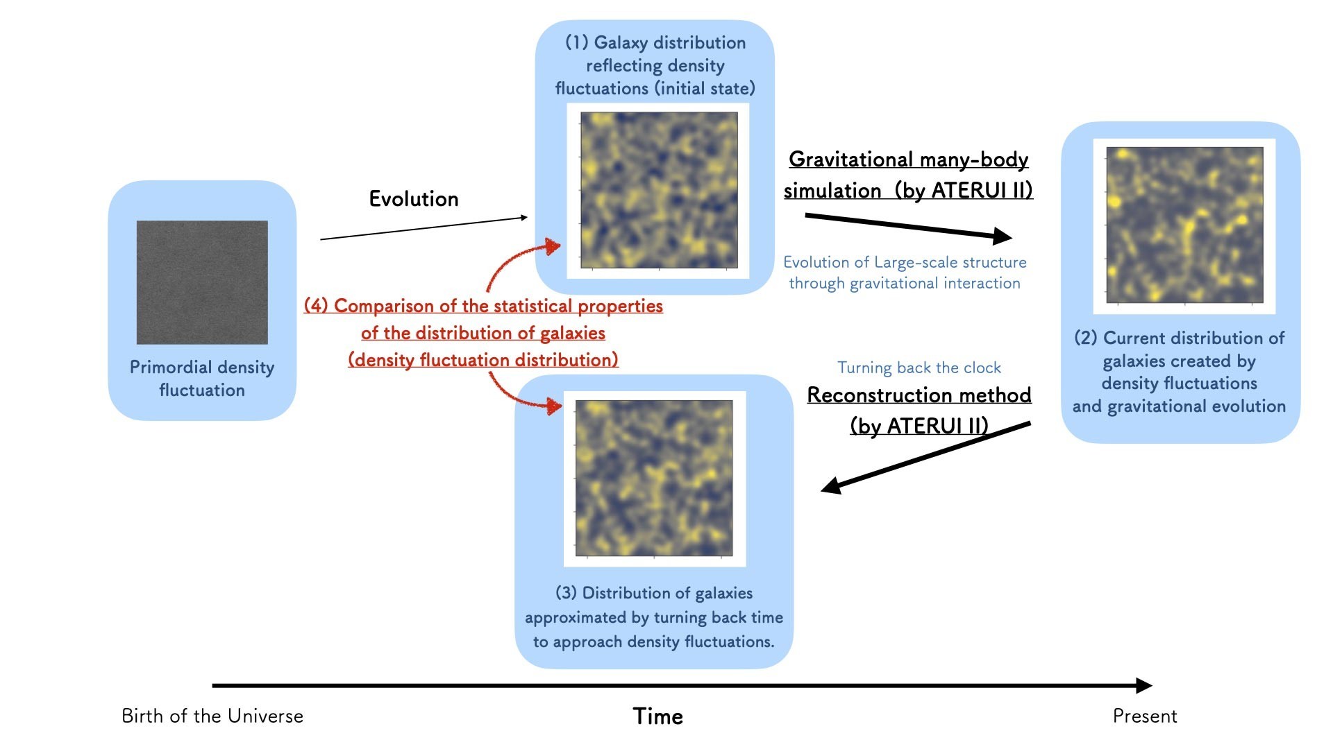 Исследовательская группа во главе с Масато Ширасаки, доцентом NAOJ и Института статистической математики, подумала о применении «метода реконструкции», чтобы повернуть время вспять и устранить гравитационные эффекты в крупномасштабной структуре. Они использовали ATERUI II, самый быстрый суперкомпьютер в мире, предназначенный для моделирования астрономии, чтобы создать 4000 смоделированных вселенных и развить их за счет роста под действием гравитации. Затем они применили этот метод, чтобы увидеть, насколько хорошо он восстанавливает начальное состояние моделирования. Команда обнаружила, что их метод может исправить гравитационные эффекты и улучшить ограничения на первичные флуктуации плотности.