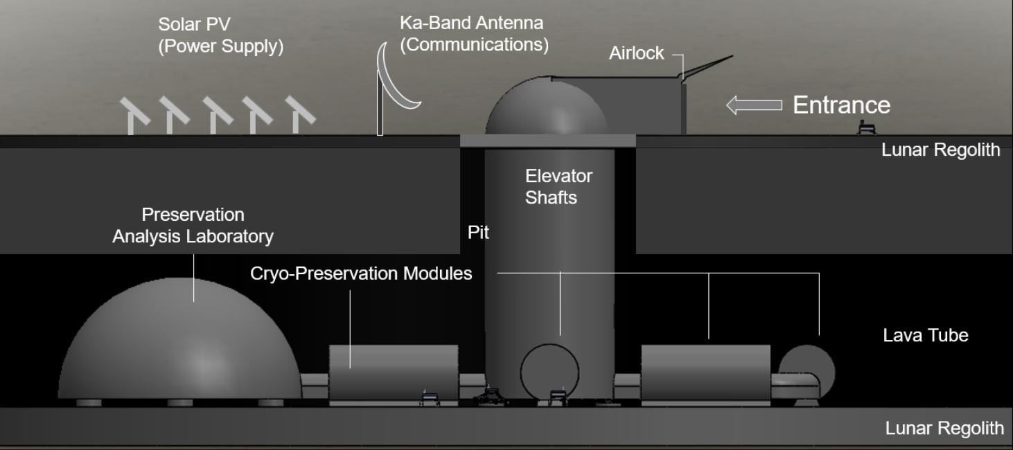 Модель подземного ковчега, созданная командой, включает в себя набор солнечных панелей на поверхности Луны, которые будут обеспечивать электричество. Две или более шахты лифта будут вести вниз в помещение, где чашки Петри будут размещены в серии модулей криогенной консервации. Дополнительная шахта грузового лифта будет использоваться для транспортировки строительного материала, так что основание может быть расширено внутри лавовых труб.