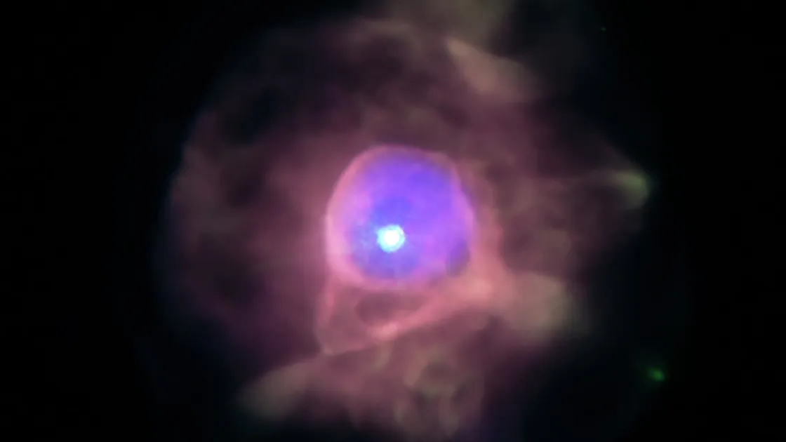 На этом новом изображении IC 4593 рентгеновские лучи от Чандры в пурпурном цвете напоминают о сходстве с аметистами, обнаруженными в жеодах по всему миру. Пузырь, обнаруженный Чандрой, — это газ, нагретый до более чем миллиона градусов. Эти высокие температуры, вероятно, были вызваны материалом, который оторвался от сморщенного ядра звезды и врезался в газ, который ранее был выброшен звездой.