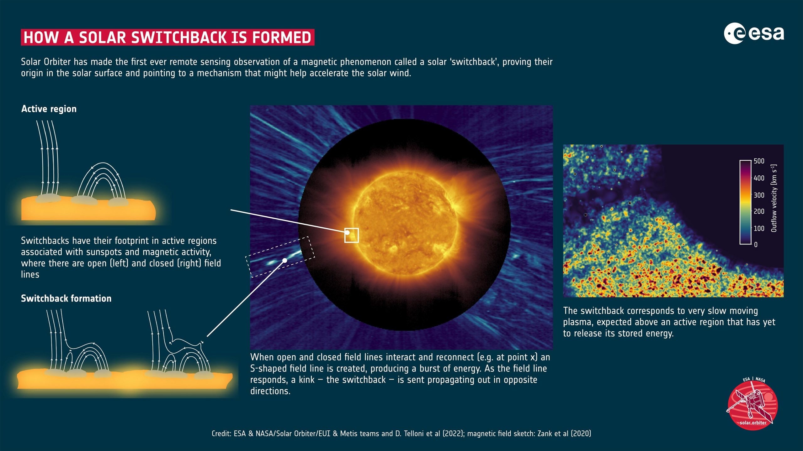 Инфографика о том, как формируется солнечный переключатель. Solar Orbiter провел первое в истории дистанционное наблюдение магнитного явления, называемого солнечным «обратным переключением», доказав его происхождение на поверхности Солнца и указав на механизм, который может помочь ускорить солнечный ветер.