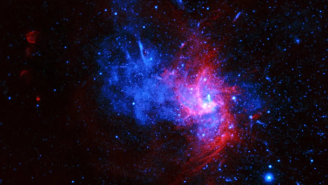 Астрономы нашли доказательства необычного типа сверхновой звезды недалеко от центра галактики Млечный Путь. Это составное изображение содержит данные рентгеновской обсерватории NASA Чандра (синий) и очень большой массив NSF (красный) остатка сверхновой, который называется Стрелец А Восток или для краткости Стрелец А Восток. Этот объект расположен очень близко к сверхмассивной черной дыре в центре Млечного Пути и, вероятно, выходит за пределы диска материала, окружающего черную дыру.