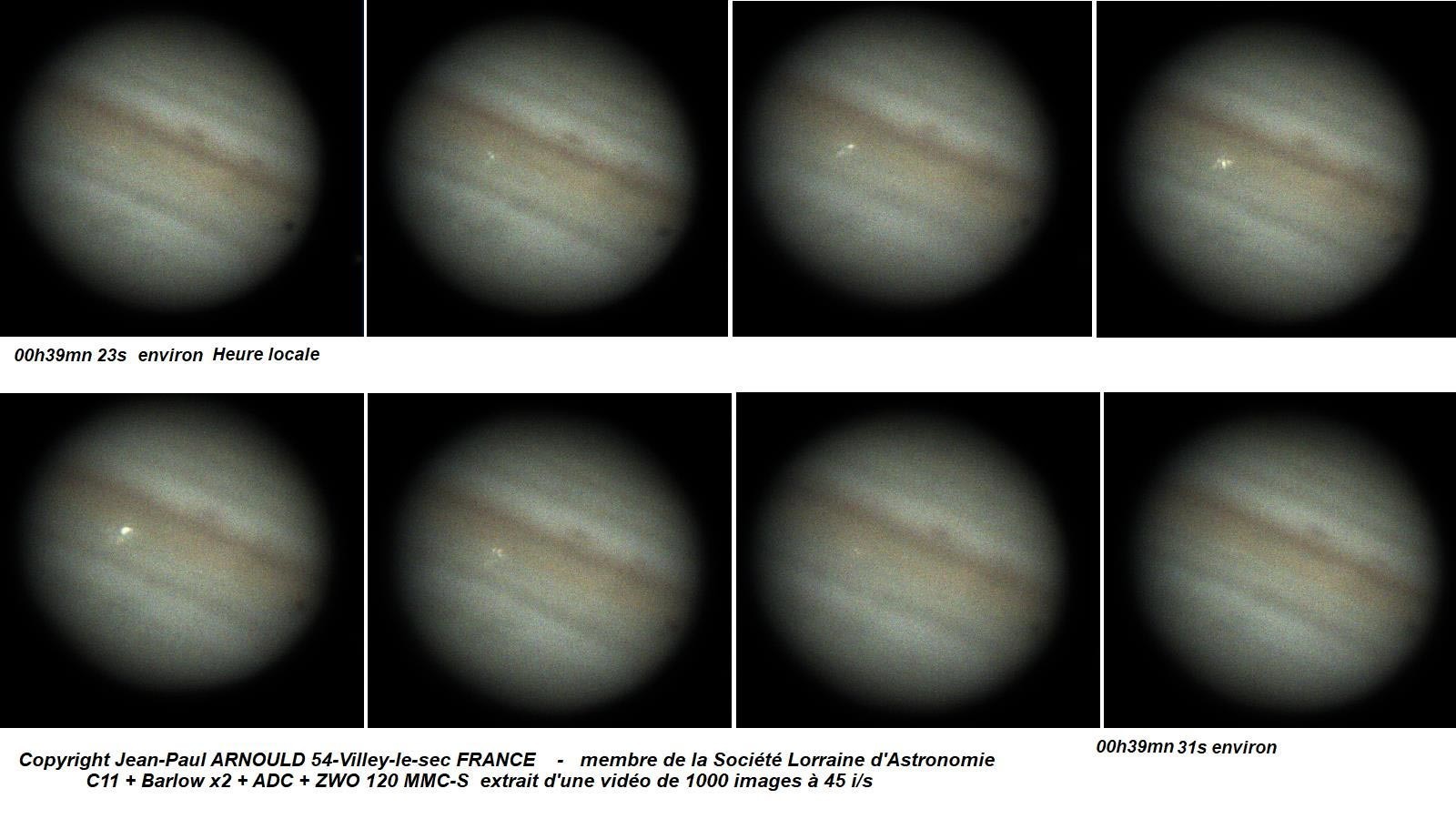 После тщательного рассмотрения, астроном определил, что вспышка произошла на Юпитерианской широте 106,9 ° (СМ1), долготе + 3,8 °. Удар независимо наблюдали две группы французских астрономов-любителей с SLA.