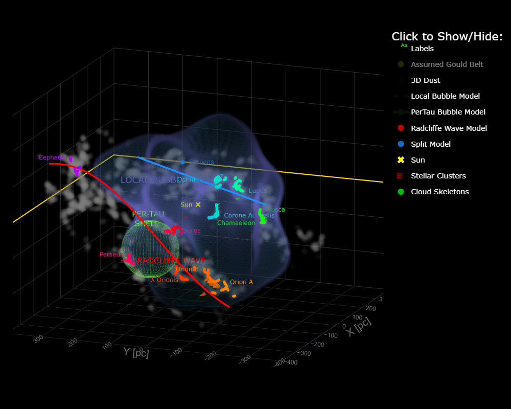 К статье прилагалась трехмерная анимированная реконструкция пространства-времени, показывающая, что все молодые звезды и области звездообразования — в пределах 500 световых лет от Земли — находятся на поверхности гигантского пузыря, известного как Местный пузырь. В то время как астрономы знали о его существовании на протяжении десятилетий, ученые теперь могут увидеть и понять происхождение Местного пузыря и его влияние на газ вокруг него.