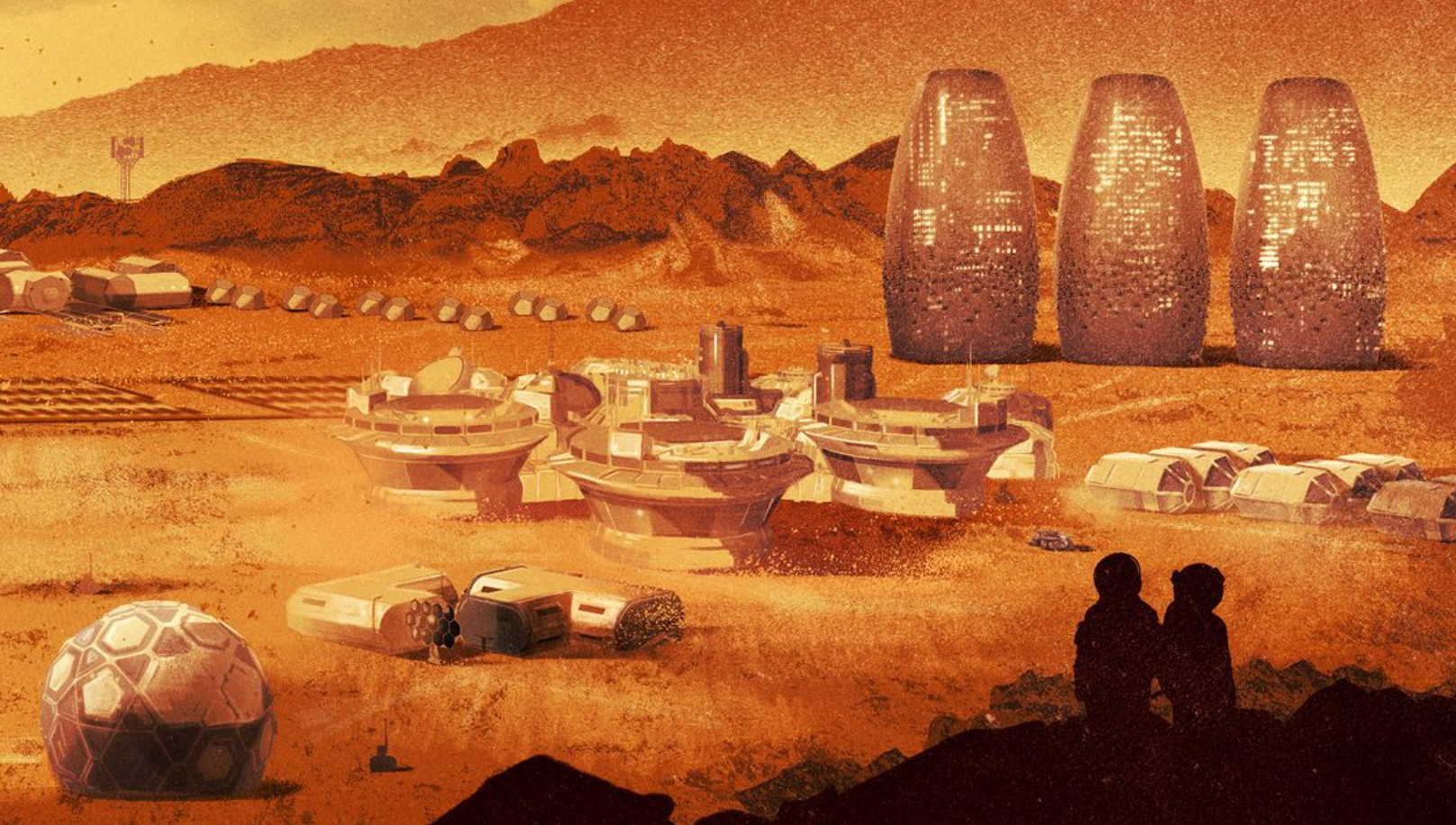 Роботизированные руки напечатают красно-коричневые марсианские жилища, нанося влажный строительный материал — смесь армированных базальтовых волокон и полимолочной кислоты, полученную из биореакторов, работающих на отходах, — быстро затвердевающими слоями. Цилиндры — идеальная форма для сосуда под давлением, потому что их изогнутые поверхности могут выдерживать более высокие нагрузки. Они также обеспечивают наибольшее внутреннее пространство. Каждое из зданий, защищенных от непогоды и соединенных между собой подземными туннелями, разделено на этажи с комфортными по площади помещениями.