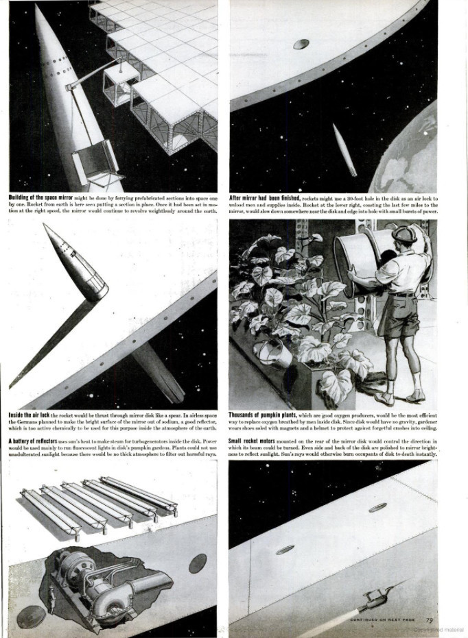 План был начат с благими намерениями, по словам Life, еще до начала Второй мировой войны. Герман Оберт, легендарный аэрокосмический конструктор, который продолжил разработку V-2 для Германии и Saturn V для США, в 1929 году разработал план орбитальной базы. Расположенная на геостационарной орбите, она будет служить заправочной станцией для космических кораблей, отправляющихся исследовать Солнечную систему.