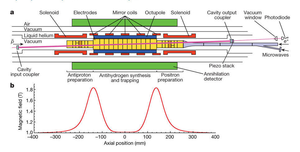 В ходе эксперимента физики сформировали атомы антиводорода из антипротонов и позитронов, а затем удерживали их в магнитной ловушке. Атомы антиводорода были подвергнуты воздействию лазера, их реакцию измерили и сравнили с соответствующими измерениями при воздействии лазера на атомы водорода. При этом использовались две частоты лазера.