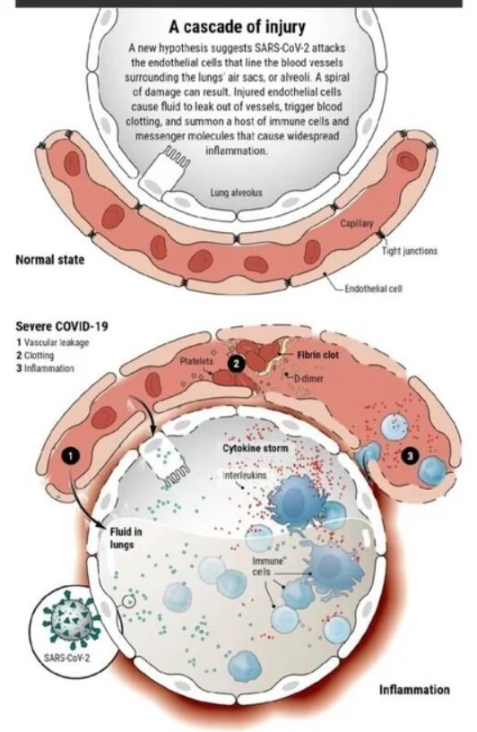Ещё одним витком развития теории стало определение причин такого странного эффекта от инфекции, которая, как казалось ранее, имеет респираторную природу. Как удалось установить группе ученых из Левенского католического университета в Бельгии, эндотелиальные клетки, покрывающие внутреннюю часть сосудов, играют роль в развитии тяжелой формы Covid-19. Атакуя их, инфекция вызывает изменение кровяного давления, образование тромбов и нарушение свертываемости крови. Это, в свою очередь, провоцирует воспаление во всем организме и способствует развитию острого респираторного дистресс-синдрома (ОРДС), ответственного за большинство смертей пациентов.