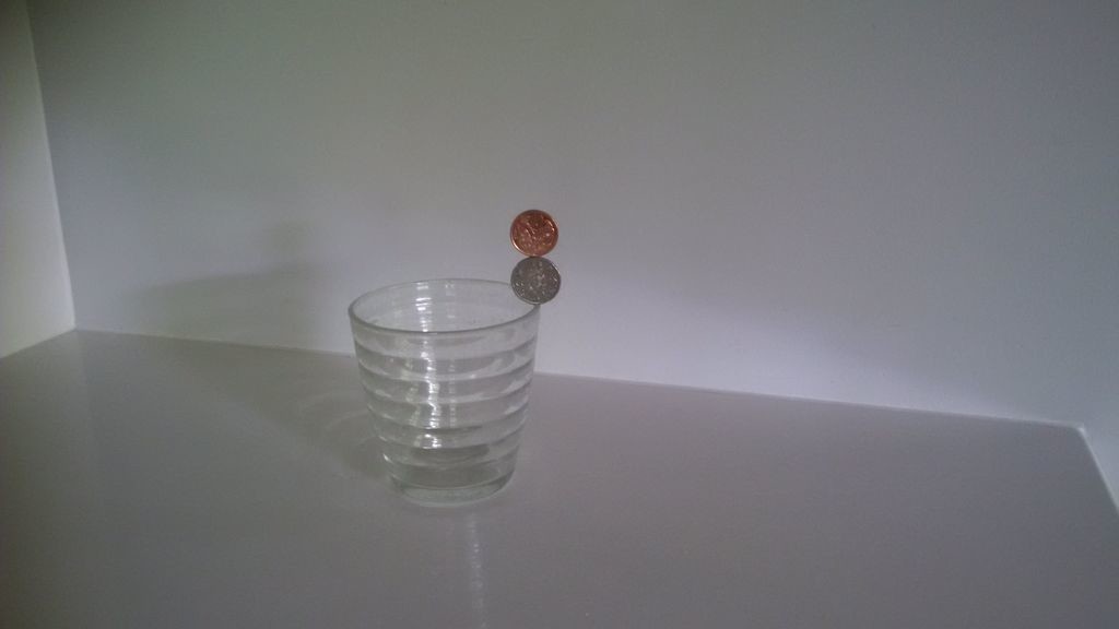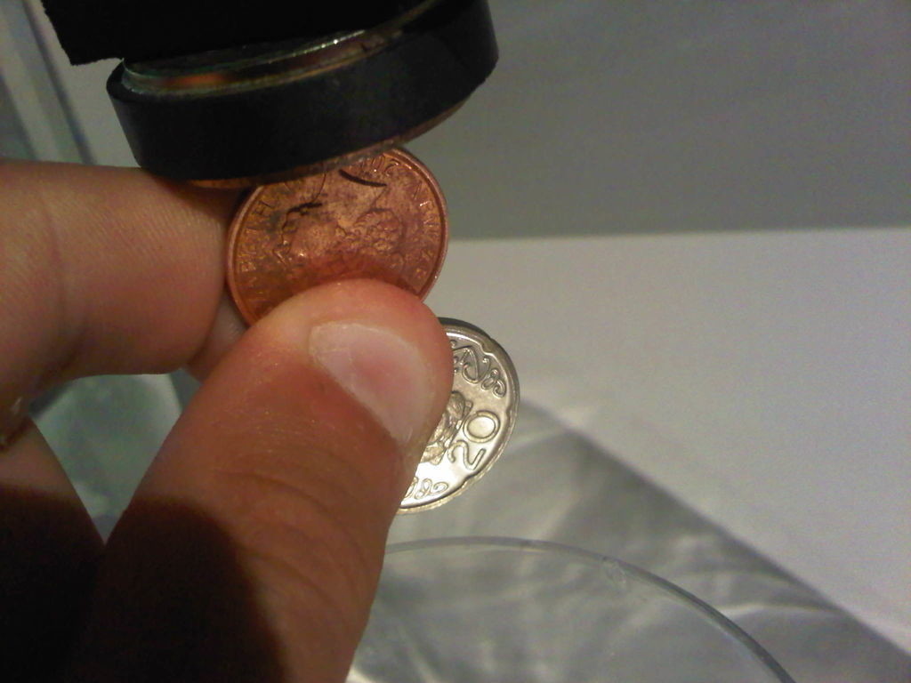 Далее монеты аккуратно отделяются от магнита и ставятся на край стакана.