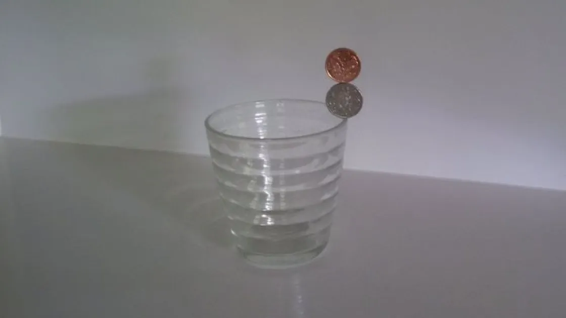 Теперь нужно аккуратно расположить монеты вертикально: верхняя касается магнита и устанавливается на ребро нижней. Край низкого стакана при этом должен располагаться прямо под центром магнитов.