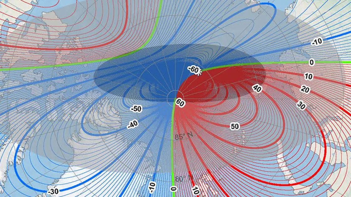 Если географический Северный полюс неподвижен, то магнитный движется вслед за изменениями в ядре планеты, где циркулируют железо и никель. Эти изменения особенно важны для систем навигации, так как они определяют точное положение магнитного поля, направленного строго вниз.
