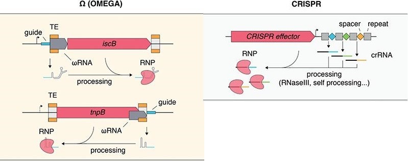Первые намеки на то, что белки OMEGA могут управляться РНК, пришли из генов белков, называемых IscB. IscB не участвуют в иммунитете CRISPR и, как известно, не связываются с РНК, но выглядят как небольшие ферменты, разрезающие ДНК. Команда обнаружила, что рядом с каждым IscB закодирована небольшая РНК, и она заставляла ферменты IscB разрезать определенные последовательности ДНК. Они назвали эти РНК «ωРНК».