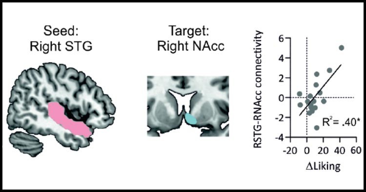 Возбуждение схемы вознаграждения перед прослушиванием музыки увеличивало удовольствие, которое участники испытывали при прослушивании песен, а подавление — уменьшало. Эти индуцированные изменения удовольствия были связаны с изменениями активности в прилежащем ядре, ключевой области цепи вознаграждения. Участники с наибольшей разницей в удовольствии также показали наибольшую разницу в синхронизированной активности между слуховой областью и областью вознаграждения.