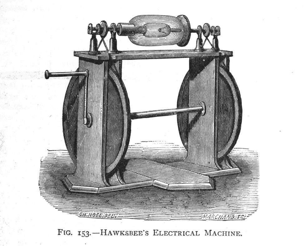 В начале 18 века английский ученый Фрэнсис Хоксби, бывший лаборант Исаака Ньютона, изобрел то, что он назвал «электростатическим двигателем». Он поместил ртуть в стекло, откачал воздух и накопил электростатический заряд, потирая рукой внешнюю сторону стекла, создав один из первых электрических генераторов.