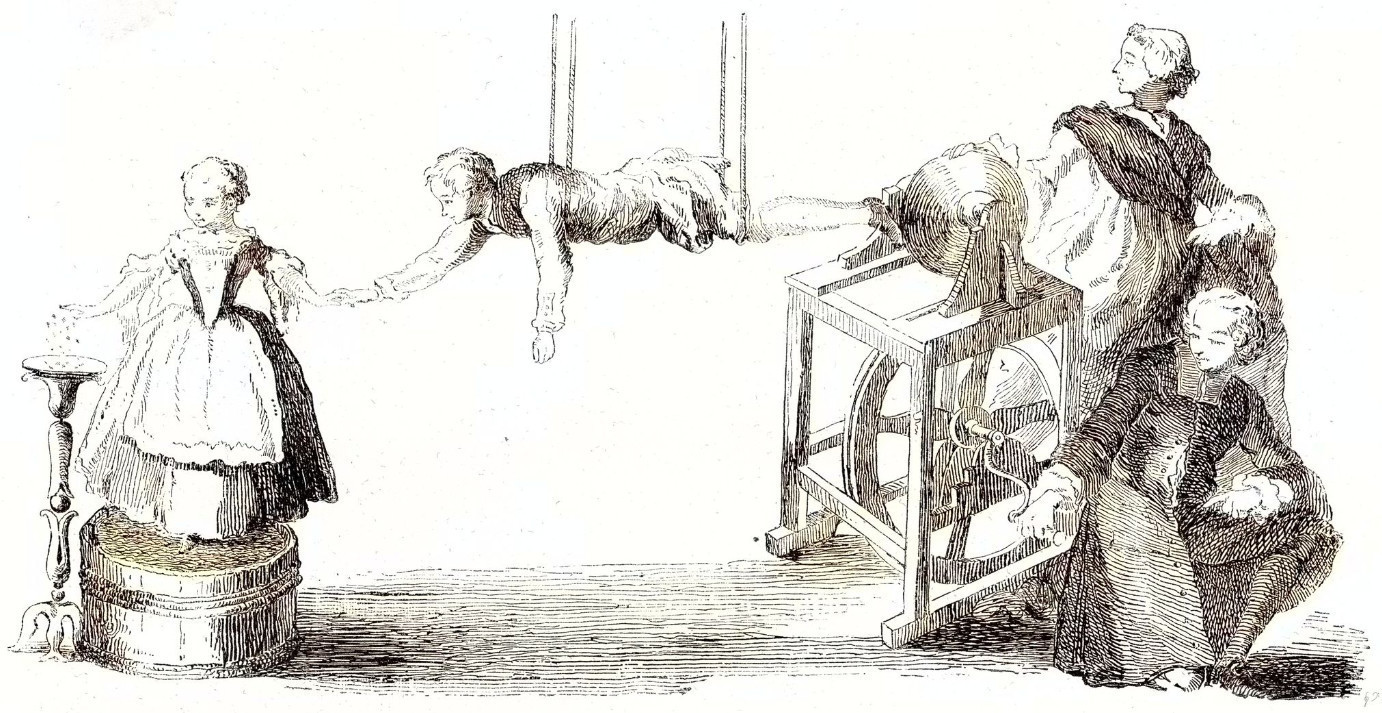 Затем, в 1729 году, ученый-любитель по имени Стивен Грей провел электростатические эксперименты (которые выглядели невероятно странно, и зачем-то включали в себя подвешивание мальчика на шелковой веревке) и обнаружил, что электричество может проходить через контакт. Таким образом, он заложил идею об электрическом токе, а также о проводниках и изоляторах. В современном материаловедении проводники — это объекты — обычно металлы — с неплотно упакованными электронами, которые обеспечивают свободный поток электричества (например, медь, цинк и золото), тогда как изоляторы — полная противоположность и заполнены плотно упакованными электронами, такими как керамика, стекло и … да шелковые веревки вполне подходят на эту роль.