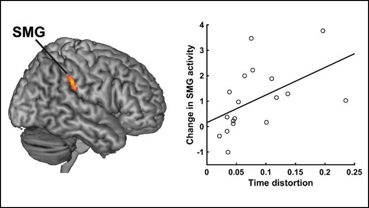 SMG, активность которого снизилась после длительной адаптации (слева). Корреляция между величиной искажения времени и изменением активности SMG (справа).