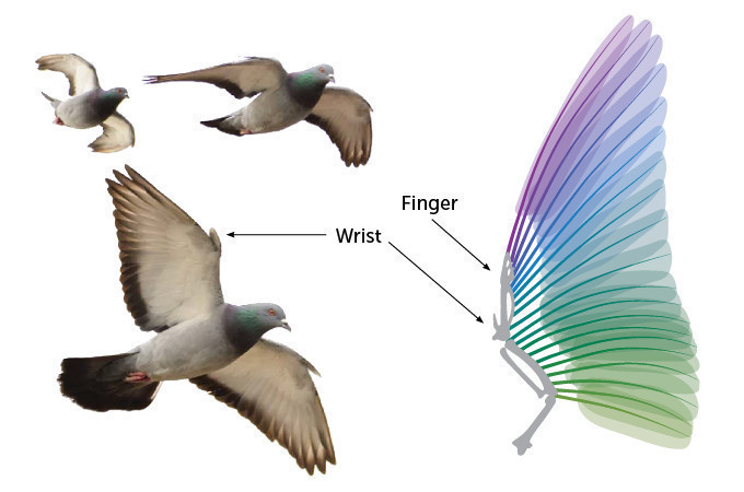 Ученые сгибали и расправляли крылья мертвых голубей, чтобы выяснить, как птицы контролируют форму своего крыла. Эти эксперименты показали, что углы двух суставов крыла, запястья и пальца, больше всего влияют на выравнивание перьев крыла. Ориентация этих длинных жестких перьев, которые поддерживают птицу в полете, определяет форму крыла. Основываясь на результатах своего исследования, команда создала робота с настоящими голубиными перьями, чьи искусственные запястья и пальцы могут изменять форму своего крыла, так же как настоящие голуби.