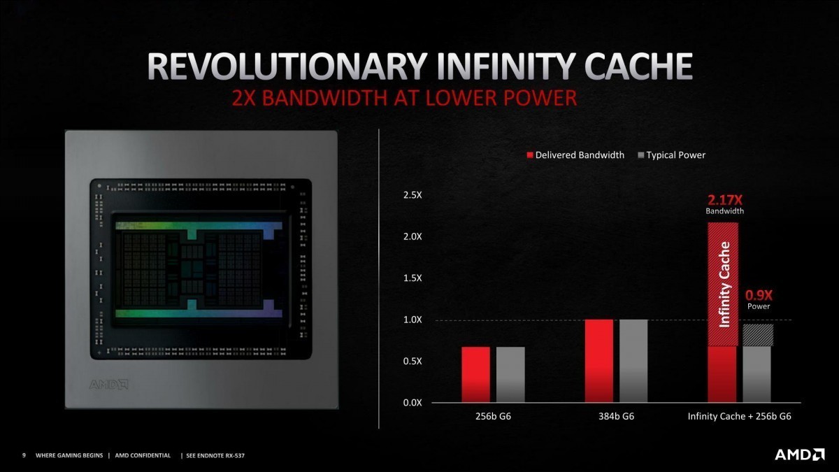 6800 XT также имеет 128 МБ того, что AMD называет Infinity Cache. Это высокоскоростной кэш-память высокой плотности на основе кэш-памяти Zen L3. Он разработан для минимизации узких мест DRAM, задержки и энергопотребления и особенно эффективен при разрешениях 4K и 1440p. AMD утверждает, что в сочетании с VRAM Infinity Cache предлагает в 2,17 раза большую эффективную пропускную способность, чем у 384-битной памяти GDDR6.