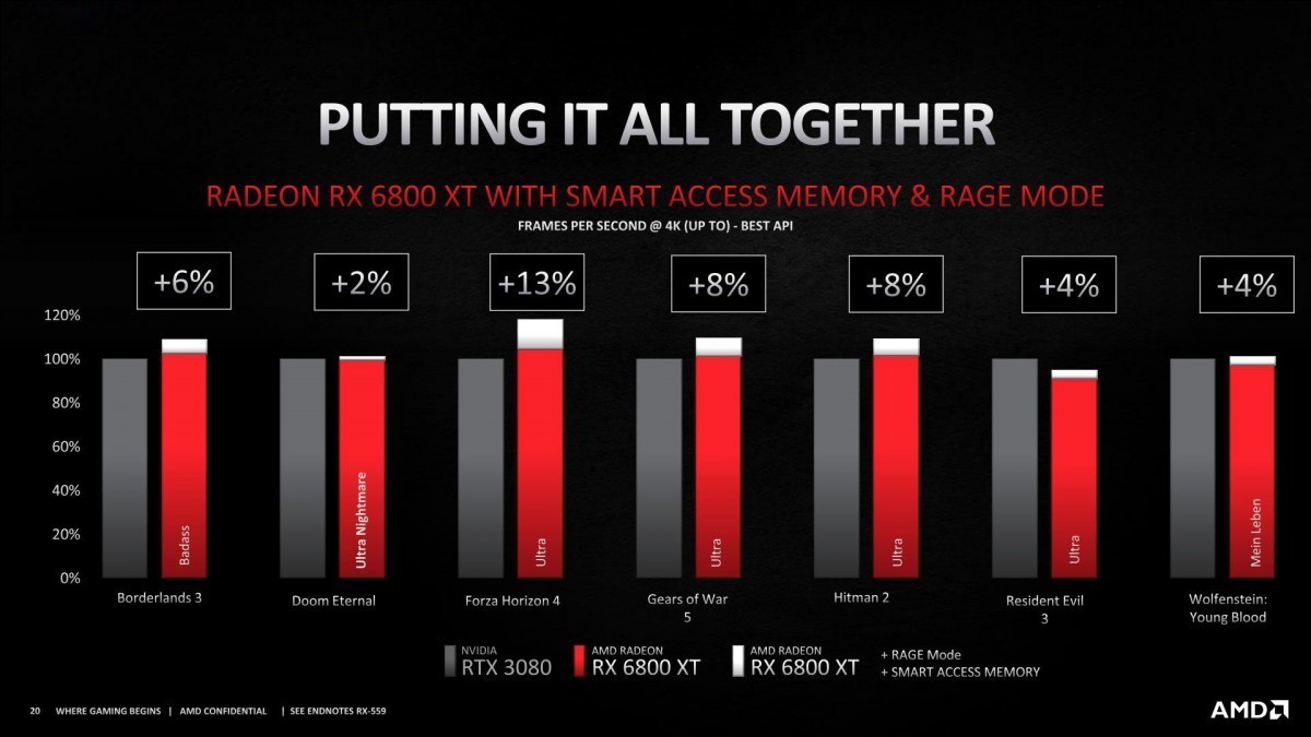 В тестовых образцах AMD они говорят о приросте производительности от однозначного до двухзначного при включенных на 6800 XT режимах ярости и интеллектуальной памяти доступа.