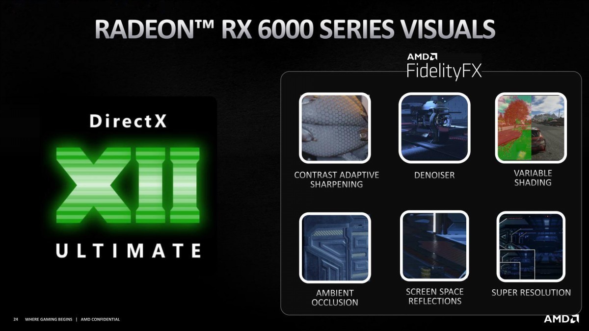 RDNA 2 также включает поддержку Microsoft DirectX 12 Ultimate API. Это обеспечивает поддержку таких функций, как трассировка лучей с аппаратным ускорением, шейдеры с переменной скоростью, сеточные шейдеры и обратная связь сэмплера — функции, которые ранее были доступны только на графических процессорах NVIDIA.