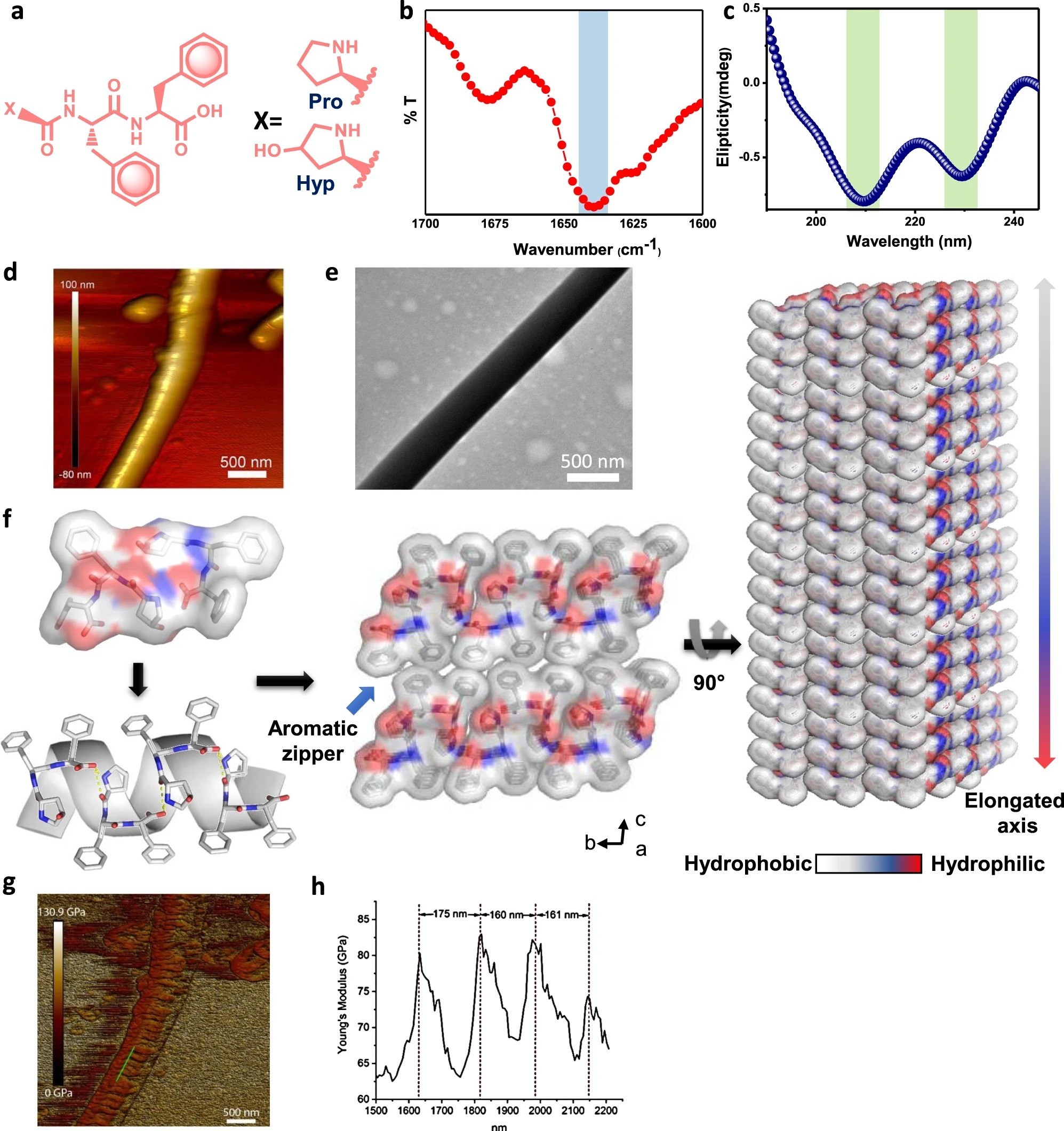 Около полутора лет назад в журнале Nature Materials эта группа опубликовала исследование, в котором мы использовали нанотехнологические средства для создания нового биологического материала, отвечающего этим требованиям. Это трипептид — очень короткая молекула под названием Hyp-Phe-Phe, состоящая всего из трех аминокислот — способная к простому процессу самосборки с образованием коллагеноподобной спиральной структуры, которая является гибкой и может похвастаться силой, аналогичной силе металлический титан. В настоящем исследовании мы стремились выяснить, имеет ли новый материал, который мы разработали, еще одну особенность, которая характеризует коллаген — пьезоэлектричество. Пьезоэлектричество — это способность материала генерировать электрические токи и напряжение в результате приложения механической силы или, наоборот, создавать механическую силу в результате воздействия электрического поля.