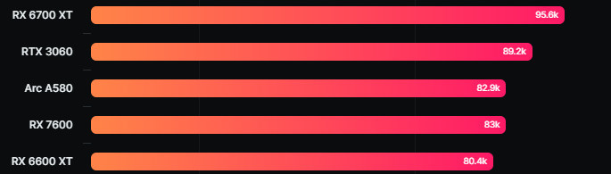 По результатам тестов производительности в OpenCL, Intel Arc A580 набрала 82 992 балла. Тестирование проводилось с использованием процессора Intel Core i7-12700 и 32 ГБ памяти DDR5-4800 на материнской плате ASUS ROG STRIX Z690-E Gaming WIFI. Продемонстрированные показатели ставят A580 на уровень с видеокартой AMD Radeon RX 7600, которая в среднем набирает около 82 981 балла, а NVIDIA RTX 3060 примерно на 6,5% быстрее.