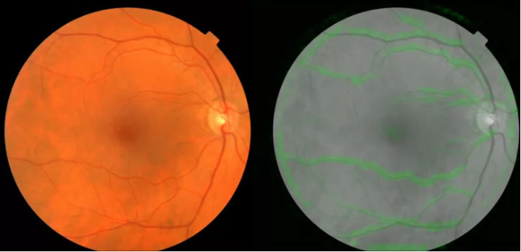 Два изображения глазного дна. Слева – обычное изображение. То, что справа, обработано с помощью алгоритма Google. Сосуды, по которым можно судить об артериальном давлении, выделены зеленым цветом