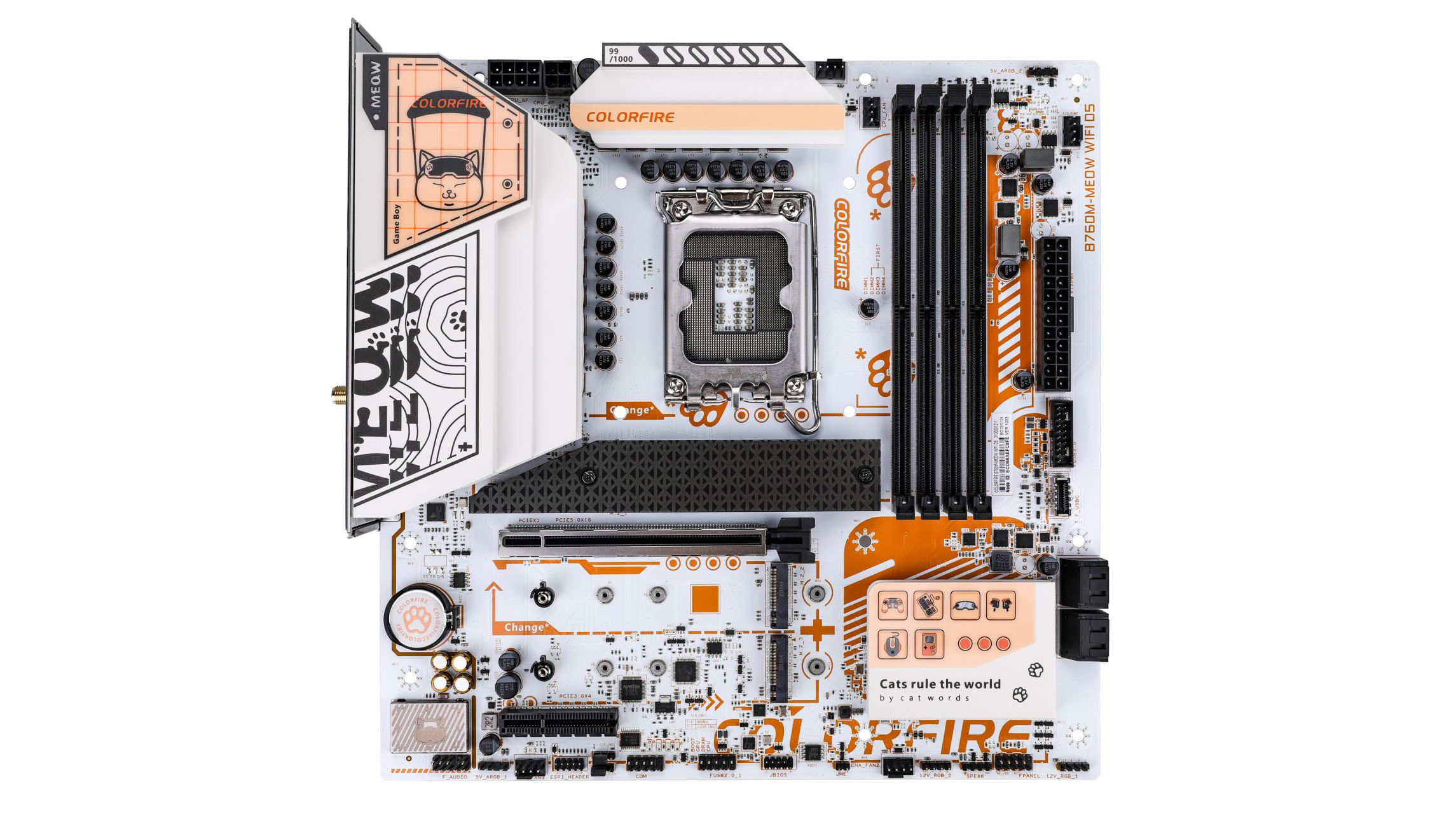 Материнская плата B760M-MEOW WIFI D5 ORANGE также имеет яркий дизайн, вдохновленный оранжево-полосатым котом Боби. Она представлена в форм-факторе micro-ATX, с белой печатной платой, радиаторами и даже батареей CMOS, выполненной в кошачьем стиле.